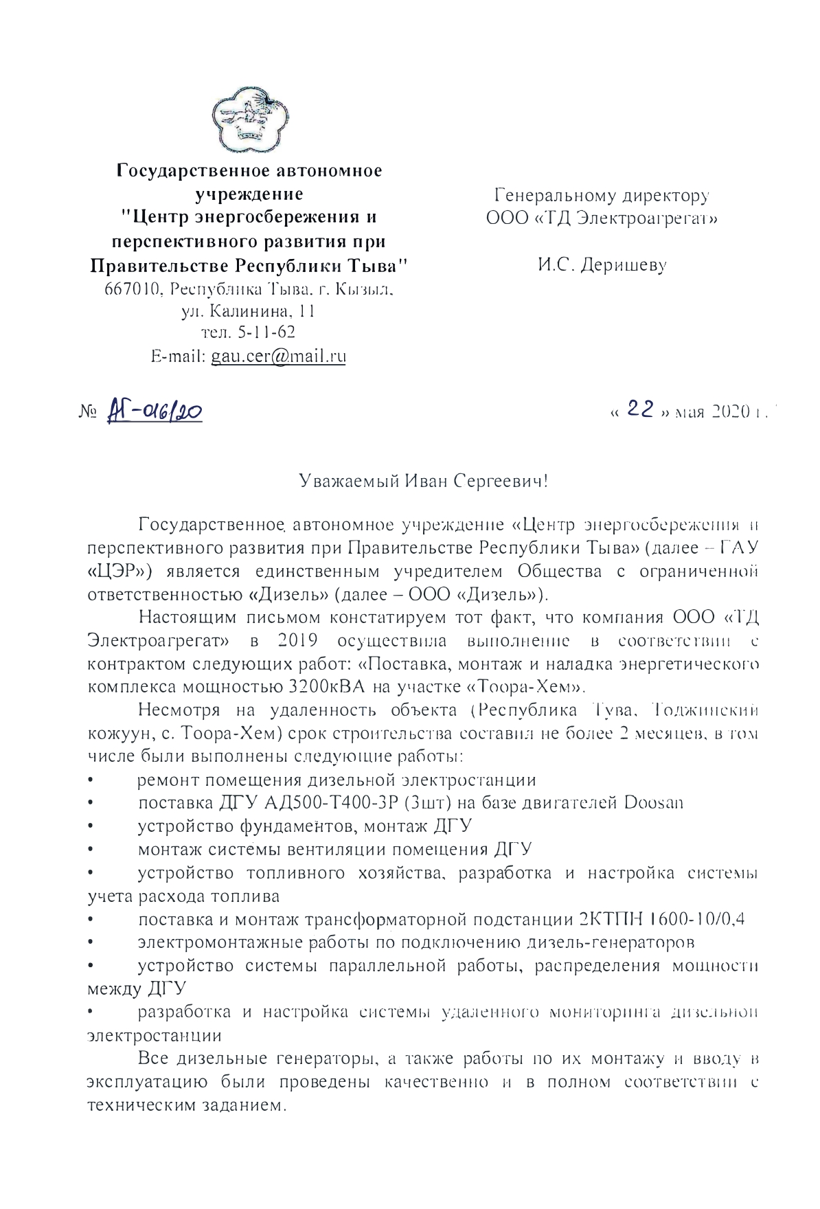 [BROWSER_TITLE] => Отзыв о выполненной поставке ДГУ компанией ООО «Торговый Дом Электроагрегат» г. Новосибирск для ГАУ "Центр энергосбережения и перспективного развития при Правительстве Республики Тыва"