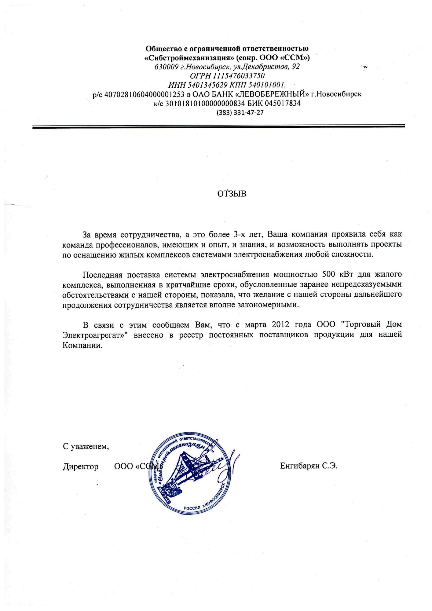 [ALT] => Отзыв контрагента о компании ООО «ТД Электроагрегат» и исполненном проекте для ООО "Сибстроймеханизация", г. Новосибирск